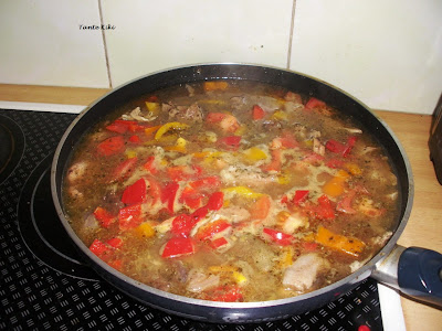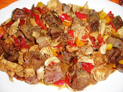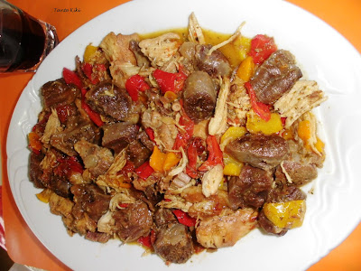 Πλένουμε τα κρέατα και τα βάζουμε σε μεγάλο τηγάνι, μαζί με το κρεμμύδι, τις πιπεριές και το λάδι να τσιγαριστούν για 5-6 λεπτά.